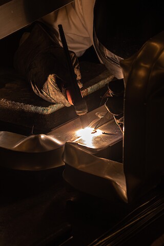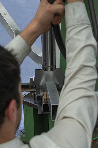 Es war nicht ganz einfach, die Matrizen und die für die Produktion benötigten Formen so auszuarbeiten, um ein ausreichend präzises und kontrollierbares Biegen der Aluminiumprofile zu ermöglichen. Der herausfordernde Prozess deckt sich jedoch mit unserer Designphilosophie, in der es um Versuch, Scheitern und Intuition geht. Nicht die Suche nach dem zeitlosen Entwurf, sondern das Verdichten individueller Gegebenheiten leitet unsere gestalterische Praxis.